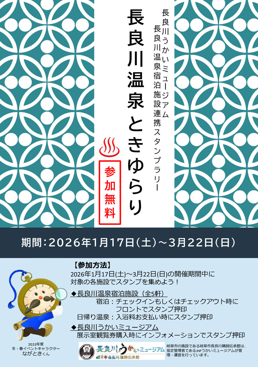 長良川温泉宿泊施設の日帰り温泉利用または宿泊、長良川うかいミュージアム観覧でスタンプを集めると賞品プレゼント!